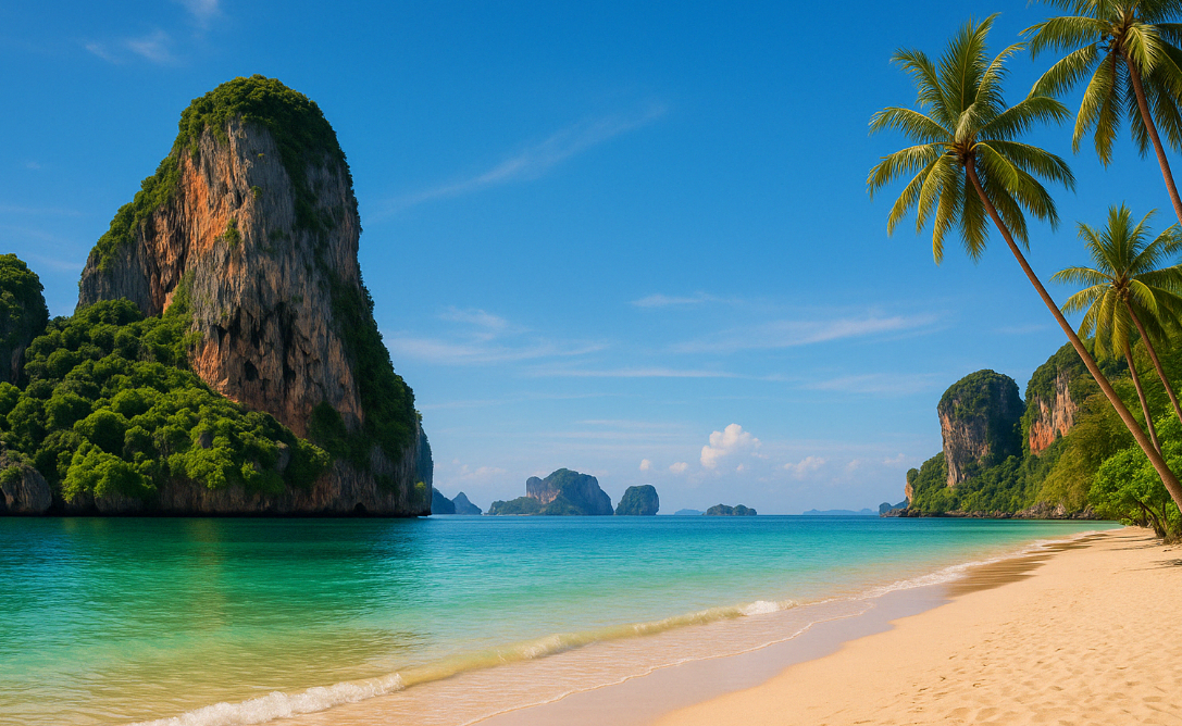 끄라비에서 가장 먼저 떠오르는 장소는 단연 **라일레이 해변(Railay Beach)**입니다. 이곳은 배로만 접근 가능한 독특한 지형 덕분에 외딴 섬 같은 분위기를 자아내며, 클리어한 바닷물과 웅장한 절벽 풍경이 조화를 이루는 명소입니다. 라일레이에서는 수영, 일광욕은 물론, 세계적인 암벽등반 스팟으로도 유명해 다양한 여행객들의 발길을 사로잡습니다.